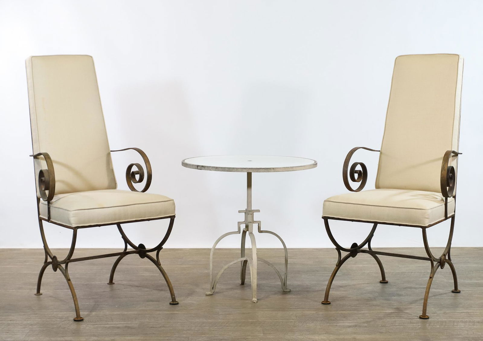 SoldWhite-Painted Wrought-Iron Bistro SetComprising a circular table and two chairs. Table: 27-1/2"h x 36-1/2"dia. Chairs: 44-1/4"hSee Sold Price