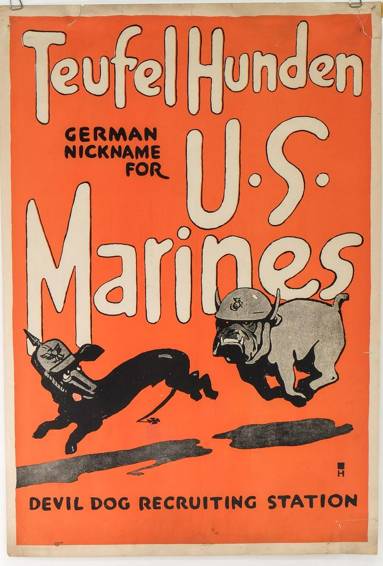 SoldWWI Devil Dog Recruiting Station Poster,United States,Circa 1917 Depicts an American bulldog chasing a dacshund wearing a pickelhaube with the title "Teufel hunden, German nickname for U.S. Marines Devil dog recruiting station" over vibranSee Sold Price