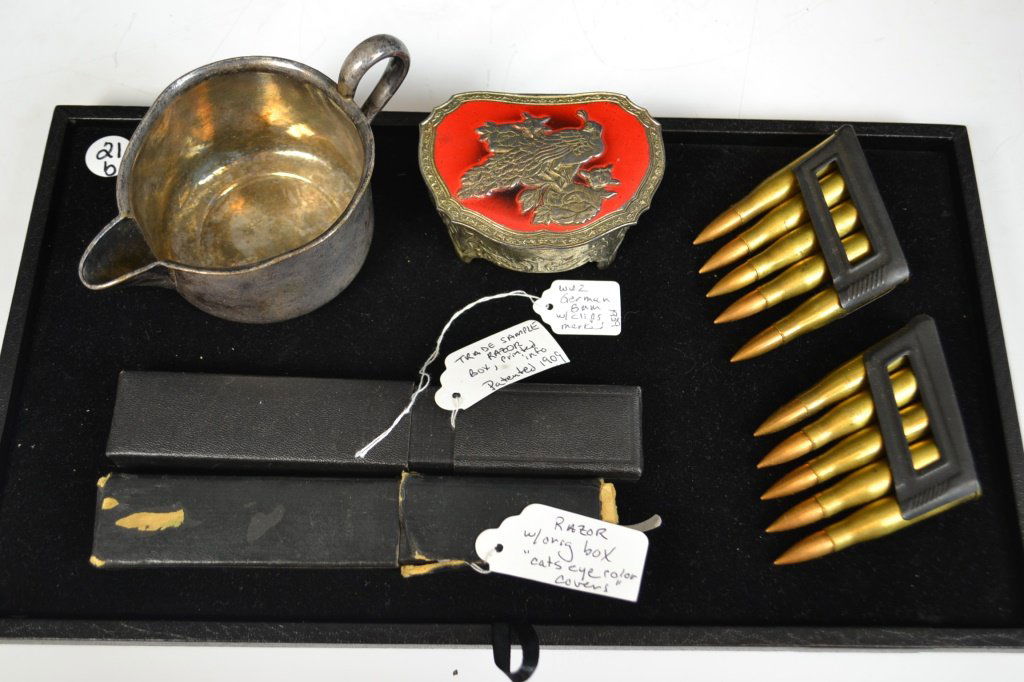 Horn Lot22 hrs LeftSterling Silver LotFeb 28, 2026Lot of Miscellaneous ItemsMar 05, 2026Great Ebayer or Collectors LotMar 28, 2026Lot of sterling silver accessories and tableware. To include: Chinese wise man figural shakers, O.Mar 01, 2026Estate Lot of 5 Antique Chinese & Bronze: Box, Bottle, Tray, Vase & Leather WalletMar 15, 2026WWII Item LotMILITARY MEDALS,MISCELLANEOUS LOT2 days LeftMISC Book and Item LotMILITARY MEDALS, WATCH CHAINS LOT2 days LeftMostly Sterling Silver Jewelry, 14K Nib, & More.Feb 28, 2026US Military WWII Era Canteen, Mess Kit, Belt, Cover Protective Individual UnusedMar 02, 2026Early US Military Leather Gaiters, Holsters, Sheathes, Cartridge Holders and MoreMar 02, 202670rds Clipped Turkish 8mm Mauser in Cloth BandoleerAn Assortment of Contemporary and Military Surplus Ammunition Including M1 Garand Clips and Greek6 days LeftSilver Items, Various Origins5 days Left