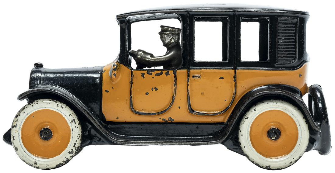 SoldArcade Limousine Yellow CabNice Arcade Limousine Yellow Cab cast iron circa 1927. Famous flat top cab painted in orange and black. Stenciled doors, nickeled lamps, seperate cast liscence, driver with painted hat, rubber tires,See Sold Price