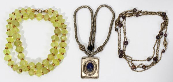 YELLOW CRYSTAL & SILVER BEAD NECKLACES, THREE