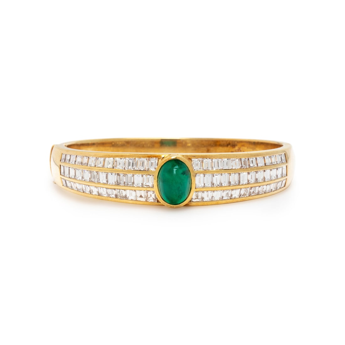 YELLOW GOLD, EMERALD, AND DIAMOND BANGLE BRACELET