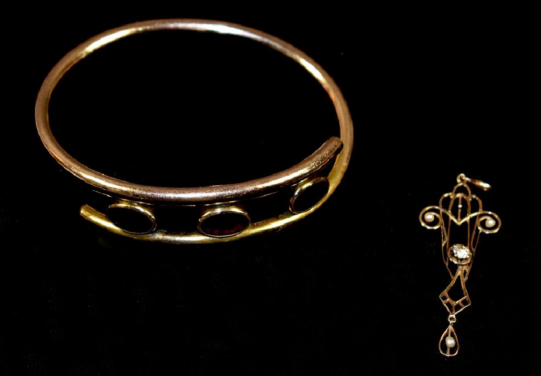 Antique 14K gold sapphire and diamond bangle bracelet. Set with central old round cut diamondTremont Auctions4.6(313)$650(5 bids)2 days Left