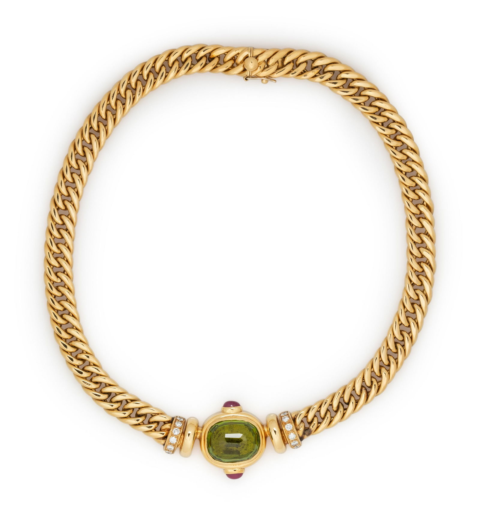YELLOW GOLD, PERIDOT, RUBY AND DIAMOND NECKLACE