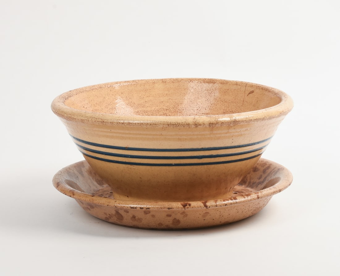 YELLOWWARE BOWL AND A SIFTER PLATE.