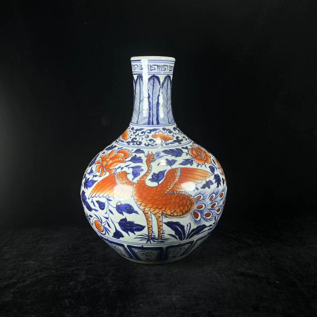 Yuan blue and white plus red phoenix pattern celestial sphere vase