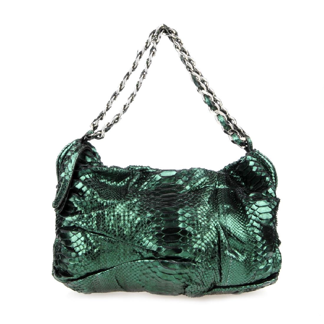 SoldNancy Gonzalez Multicolored Python Bag, 2000s Nancy Gonzalez Multicolored Python Bag, 2000s   Metallic gold python handbag with gathered front and back detailing, matching dual top handles, Label: Nancy GonzalezStyle/Serial Number: UnlabeledSee Sold Price