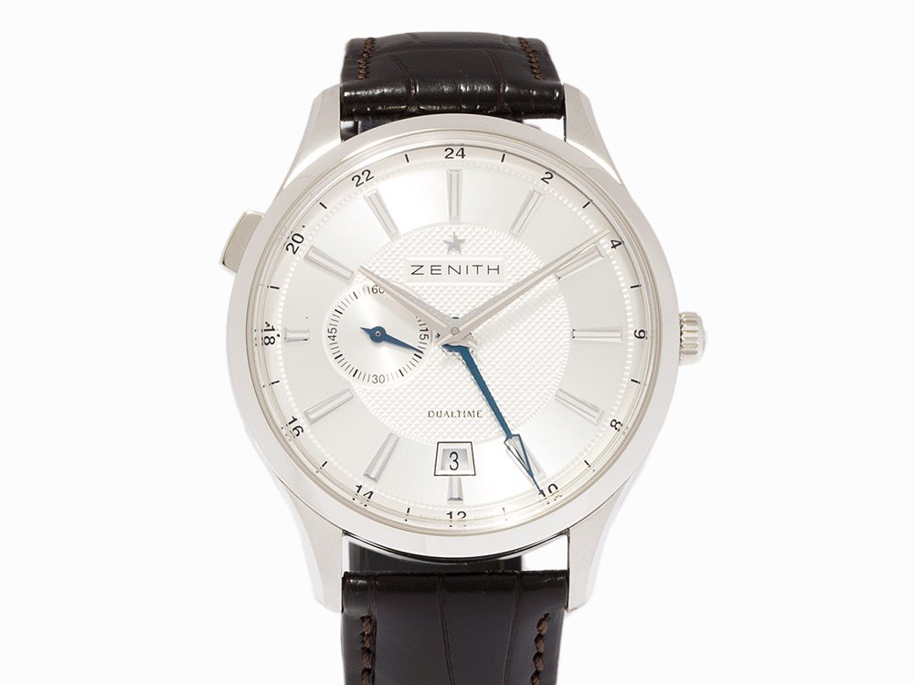A STAINLESS STEEL 'ELITE CAPTAIN POWER RESERVE' AUTOMATIC CALENDAR WRISTWATCH WITH POWER RESERVE, BYA STAINLESS STEEL 'ELITE CAPTAIN POWER RESERVE' AUTOMATIC CALENDAR WRISTWATCH WITH POWER RESERVE, BY ZENITH, CIRCA 2019 38-jewel Cal-685 automatic movement, circular guilloché dial, applied polis