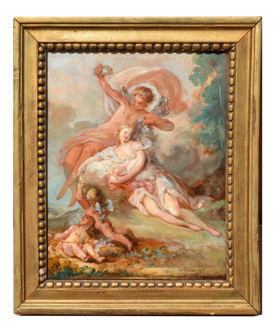SoldFrench school of the XVIII century. "Flora and Zephyr". Oil on canvas. Relined. Regency styleFrench school of the 18th century. "Flora and Zephyr. Oil on canvas. Relined. Regency style frame, ca.1900. Size: 102 x 81 cm; 117 x 97 cm (frame). Flora, goddess of the spring, appears seated with heSee Sold Price