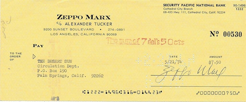 Zeppo Marx- Signed Bank Check