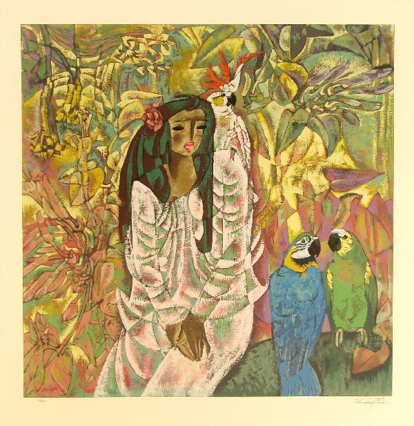 SoldZhou Ling (b. 1941) ChineseWOMAN WITH BIRDS, color screenprint, signed in pencil, numbered 238/300, image 30 x 31”, full margins, published by Gregory Editions, printed by Soma Fine Art Press, framed, with very mild cockling,See Sold Price