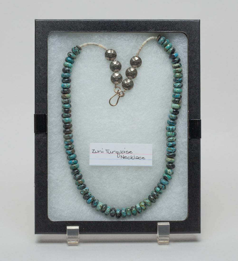 SoldZuni Turquoise Like NecklaceCollectible Zuni turquoise like disc necklace, with case. 20inch L.See Sold Price