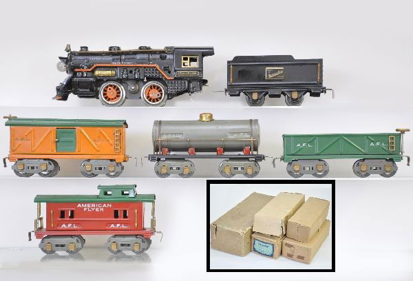 Browse a record of outcomes from past auctions, including sale prices and unsold items.American Flyer O-Gauge Hudson Steam Freight Model TrainNice American Flyer Train SetAmerican Flyer O gauge 432 loco and freightAmerican Flyer Burlington Zephyr loco and two carsAmerican Flyer loco and tender w/3150, 3151, 3152American Flyer 420 loco, tender, red passenger caAmerican Flyer O gauge steam freight set, 447American Flyer 1217, 1105, 1206, 1206 passenger tAmerican Flyer 570, NYC, 494, 495, 495 w/boxesChrome Plated American Flyer O gauge center cab lNine American Flyer O gauge freight carsAmerican Flyer O gauge No. 3105, 3150, 3151, 3152American Flyer 447 loco and tender 1621, 1621, 16American Flyer 3105 elec. loco, four 8 wheel passAmerican Flyer wide gauge passenger carsGreat looking American Flyer The Statesman pass.Boxed American Flyer 1386 Golden State passengerEarly American Flyer Steam Freight SetAmerican Flyer 3/16 O Train SetFour American Flyer electric locos, 1097, 3100, 10American Flyer No. 10? loco, 121, 1107, 1108American Flyer 4692 loco, 4693 tender, 4022, 4017Lot of 2: American Flyer Passenger Train Sets.American Flyer 4011, 4017, 4017, 4018, 4020 freight
