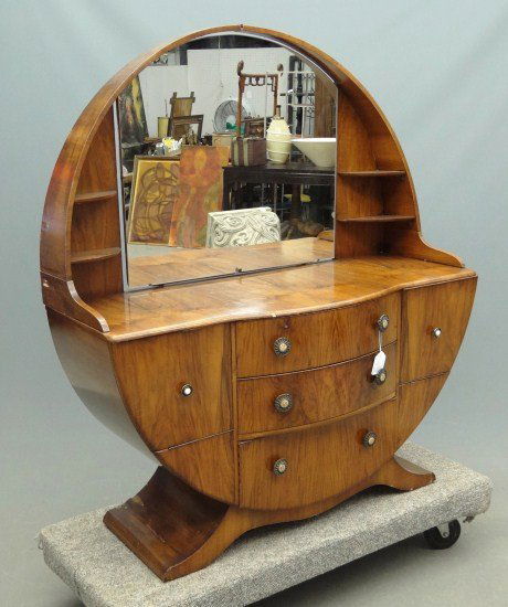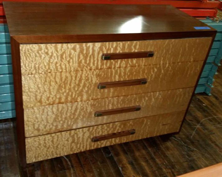 ![Art Deco Chest of Drawers: Modern blonde mahogany five drawer chest with curved edges at sides and bold chromed steel circular pulls. [38 1/2" W x 20"D x 50 3/4" H]. Wear throughout with scratches and scuffs (including pulls).](https://p1.liveauctioneers.com/1221/75115/39600168_1_x.jpg?height=280&quality=70&sharpen=true&version=1438800613&width=280)
