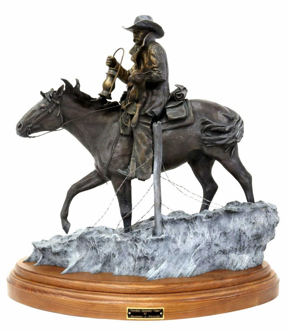 ![BRADFORD WILLIAMS (B.1948) WESTERN BRONZE SCULPTURE, 'HELL BENT': Patinated bronze sculpture, "Hell Bent," signed in cast Bradford J. Williams (Colorado/ Arizona, b.1948), numbered 2/ 30, dated [19]99, rising on wood swivel base with central title pla](https://p1.liveauctioneers.com/21/334068/180506261_1_x.jpg?height=280&quality=70&sharpen=true&version=1718918057&width=280)