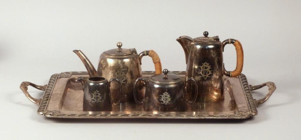 ![Silver Plate Tea Set and Tray: Silver plate tea set and tray comprising: footed teapot, creamer and sugar bowl, and a double-handled tray with gadrooned and shell border. Monogrammed. [Teapot: 10 1/2" H; Tray: 26 3/4" x 15 1/2" W].](https://p1.liveauctioneers.com/1221/72299/37781692_1_x.jpg?height=280&quality=70&sharpen=true&version=1432061098&width=280)