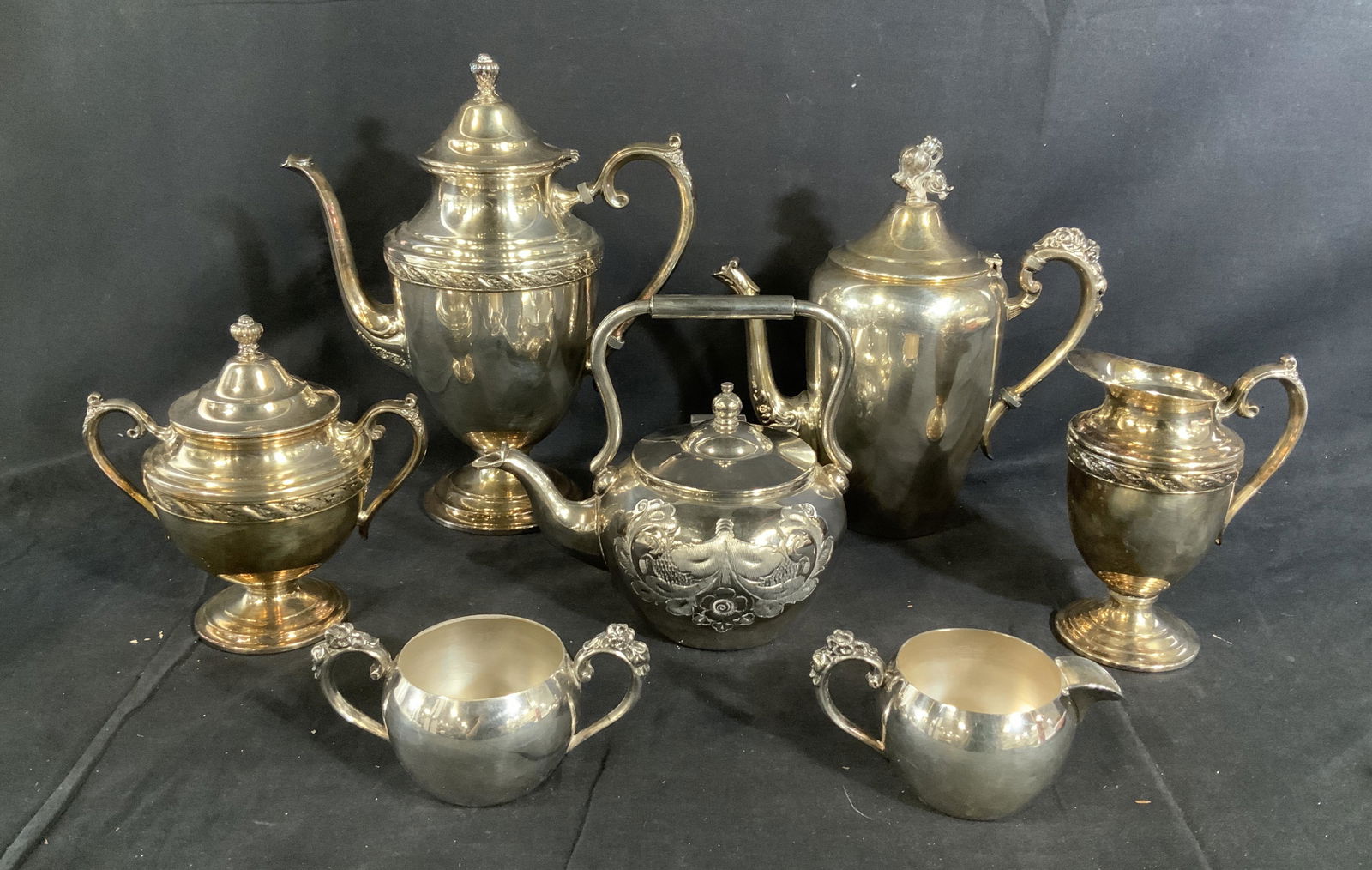 ![Continental Silver Tea Set - 3 pcs: Three piece Continental silver tea set, including teapot [12" H], creamer [7" H], and open bowl [5" H]. All over repousse design. 54 ozt. inclusive. In good condition.](https://p1.liveauctioneers.com/1221/246929/128534914_1_x.jpg?height=280&quality=70&sharpen=true&version=1652328696&width=280)