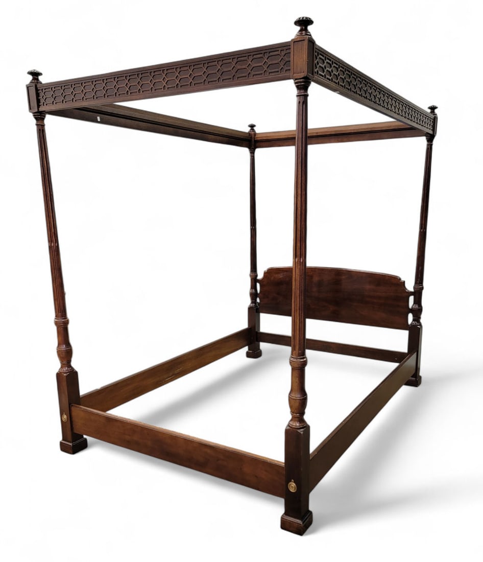 ![Contemporary Mahogany Four-Poster Bed: Features turned supports with fluted accents and two acorn finials at front. [70" W x 85" D x 109" H]. Scuffs and scratches.](https://p1.liveauctioneers.com/1221/63251/31943019_1_x.jpg?height=280&quality=70&sharpen=true&version=1414715036&width=280)