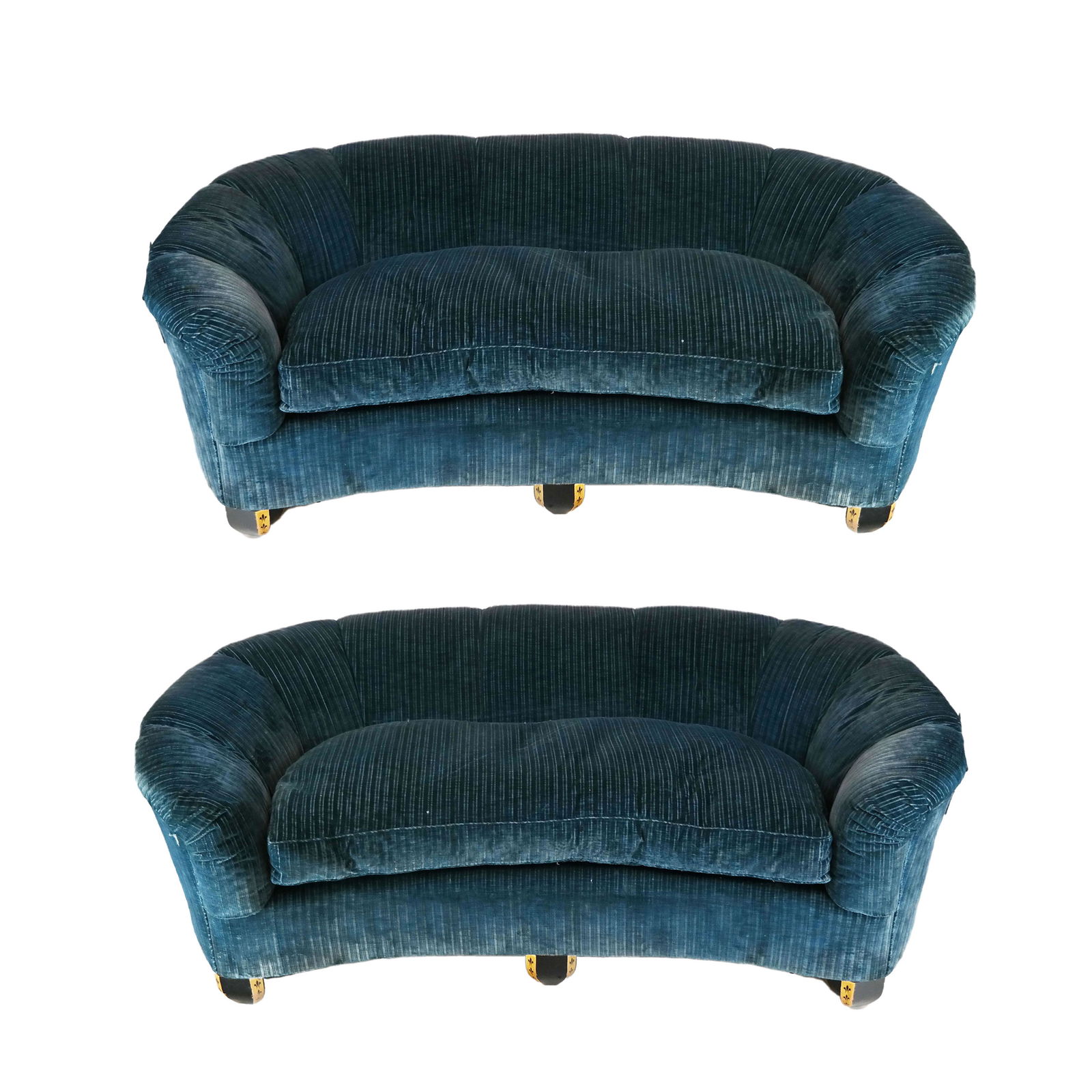 ![Pair of Modern Teal Blue Corduroy Sofas: Pair of curved sofas, on black and gilt wood legs, each with a single loose feather cushion. [29" H x 77" W x 43" D]. Allover wear to upholstery.](https://p1.liveauctioneers.com/1221/232387/120526758_1_x.jpg?height=280&quality=70&sharpen=true&version=1642199457&width=280)