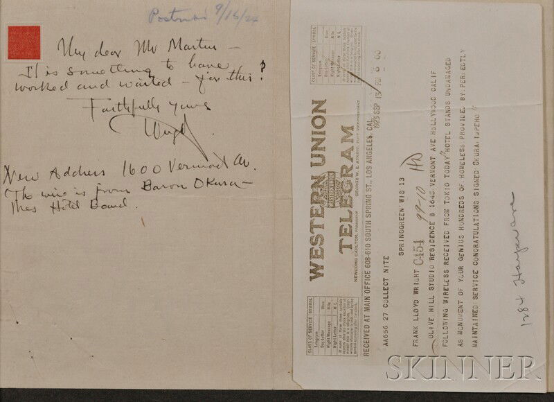 Browse a record of outcomes from past auctions, including sale prices and unsold items.Frank Lloyd Wright sconce, from the Hotel Geneva,Frank Lloyd Wright coffee table, manufactured by HWright, Frank Lloyd (1869-1959), Autograph note si(8) Frank Lloyd Wright Paper Items. Including (3)FRANK LLOYD WRIGHT Buildings, Plans and Designs HorPair of Chairs, Manner of Frank Lloyd WrightAntique LUXFER Prism Glass Tile - Frank Lloyd WrightOak Dining Table Frank Lloyd Wright/ John HowePair Frank Lloyd Wright Style Stained Glass WindoFRANK LLOYD WRIGHT STYLE OAK CONSOLE DINING TABLEFrank Lloyd Wright (1867-1959) for Heritage Henredon,Set of 6 Frank Lloyd Wright Dining Chairs.JOHNSON'S WAX DECO FRANK LLOYD WRIGHT TOWER LIGHTERFrank Lloyd Wright, Buildings Plans and Designs, Tokyo,Tower Tree Escaped Crowded Forest Wright, Frank LloydAfter Frank Lloyd Wright (American, 1867-1959) Two6 Stickley Cherry dining chairs - Frank Lloyd WrightPair FRANK LLOYD WRIGHT UPHOLSTERED Mid-Century ChairsPampaloni Argenti for Tiffany Frank Lloyd Wright DesignFRANK LLOYD WRIGHT BY TIFFANY & CO. MUGS & BOWLSFrank Lloyd Wright on "This Matter of Fellowship",Tiffany Dessert Service, Frank Lloyd Wright in ImperialFrank Lloyd Wright (American, 1867-1959) Plans fFrank Lloyd Wright Pencil Signed Litho McAfee House