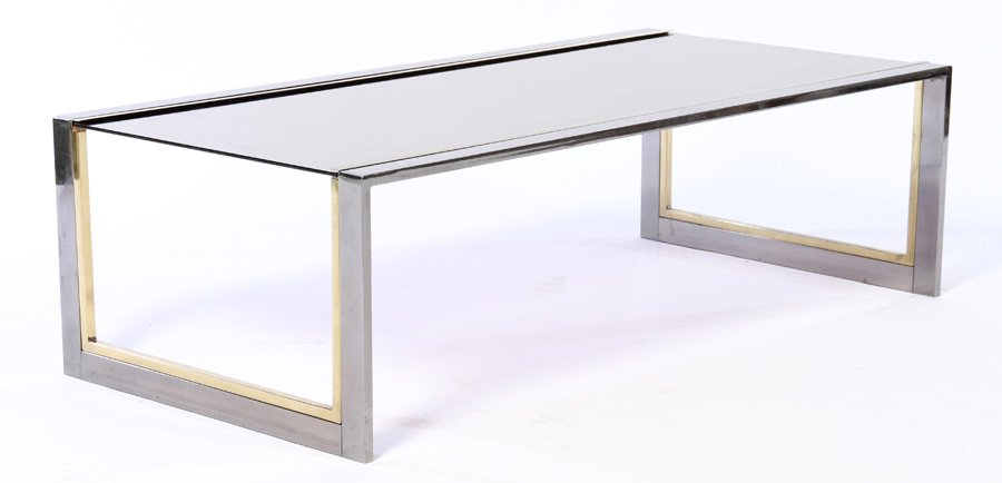 ![Chrome & Black Glass MCM Coffee Table: Mid-century modern chrome and black glass coffee table. [12 1/2 x 27 5/8 x 39 1/4 inches]. Normal wear as with age.](https://p1.liveauctioneers.com/1221/179614/90417283_1_x.jpg?height=280&quality=70&sharpen=true&version=1600712863&width=280)