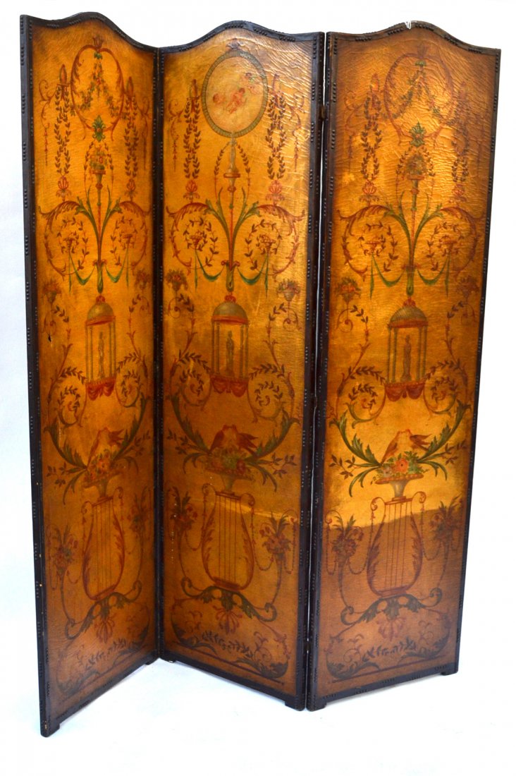 ![Adams Style Three-Panel Floor Screen: Each panel bears a dome top and painted neoclassical style arabesque decor. Minor wear to each panel. [79" x 22"]. Unven toning and craquelure.](https://p1.liveauctioneers.com/1221/45281/20770794_1_x.jpg?height=280&quality=70&sharpen=true&version=1379343362&width=280)
