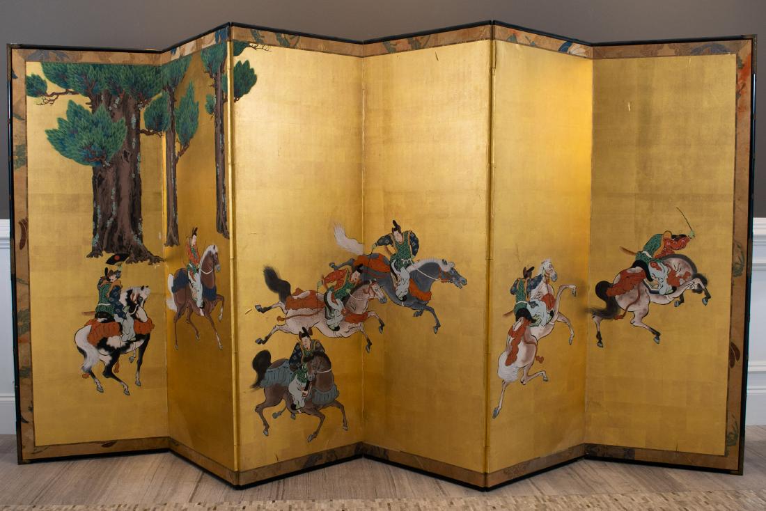 ![Chinese Four-Panel Gilt Calligraphic Floor Screen: Tall floor screen with each panel bearing three columns of calligraphic script against a gold leaf background. Each panel: 23 3/4" x 96" [8']. Few scuffs, otherwise in good condition.](https://p1.liveauctioneers.com/1221/30583/12144798_1_x.jpg?height=280&quality=70&sharpen=true&version=1340487234&width=280)