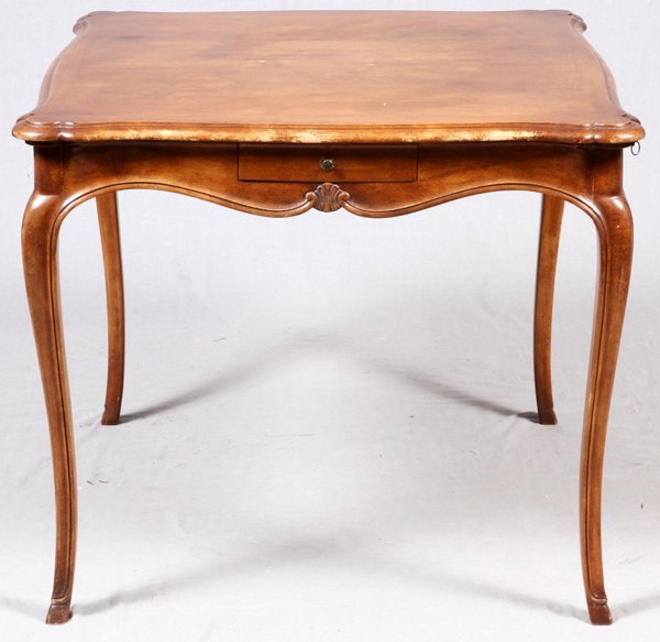 ![Milling Road - Baker Pair of French-Style Tables: Pair of Milling Road Baker Furniture French-style walnut tray top style square side tables, having a single drawer, scalloped apron with brass pull rings, on cabriole legs. [23 1/4" H x 27" W x 27" D]](https://p1.liveauctioneers.com/1221/251963/131518757_1_x.jpg?height=280&quality=70&sharpen=true&version=1656179466&width=280)