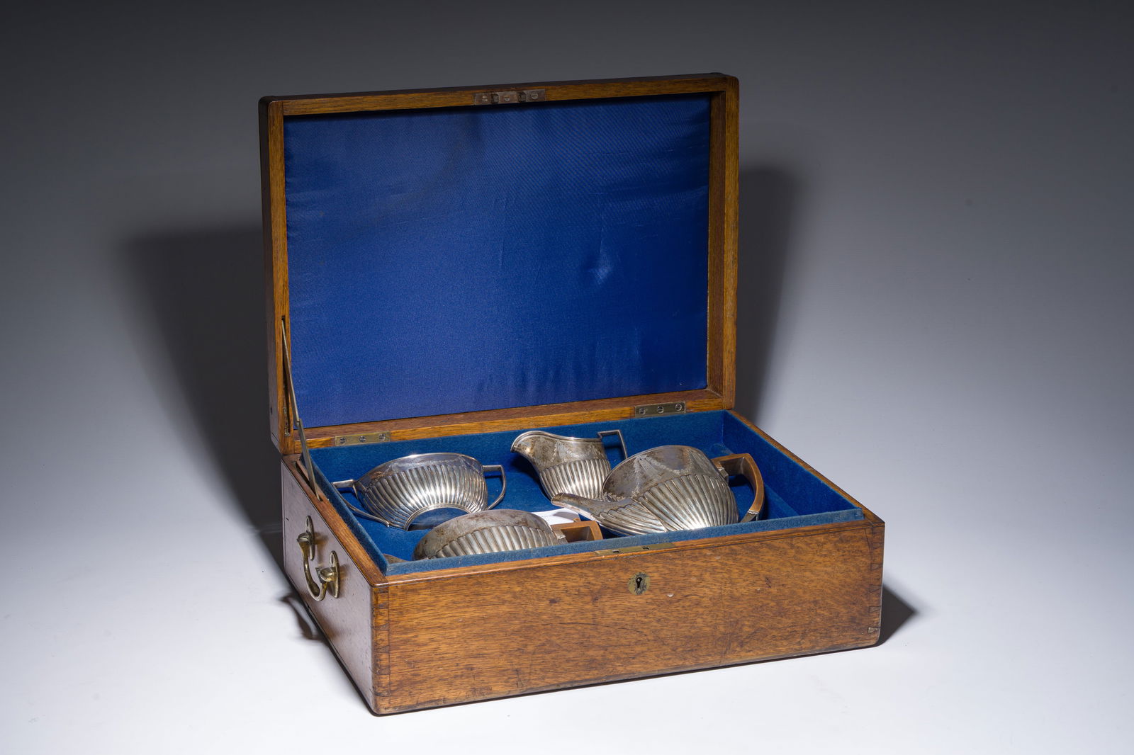 ![Three Pieces Painted Toleware: American, 19th/20th century, light house form coffee pot with old paint decoration, 10-1/2 in., [fading, wear and crazing to paint decoration, grime]; dome shaped document box, 5-1/4 x 9 x x 4-1/2 in.](https://p1.liveauctioneers.com/33/131921/67027440_1_x.jpg?height=280&quality=70&sharpen=true&version=1543252578&width=280)