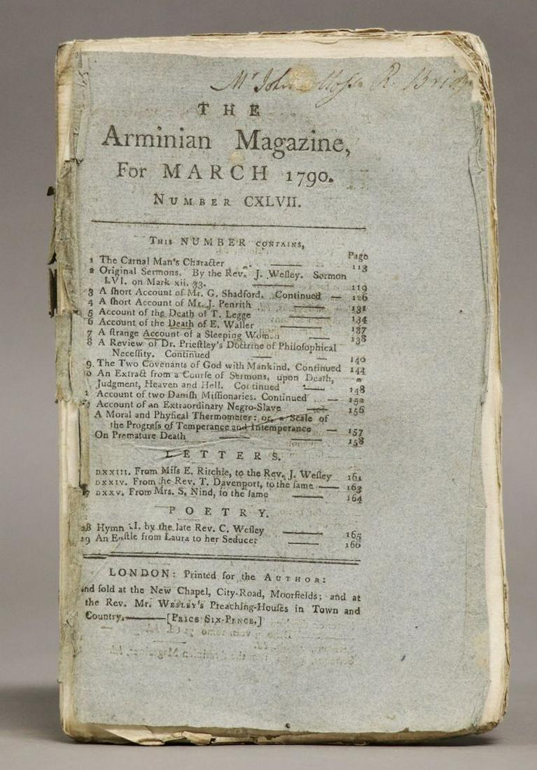 ![[Slavery] 18th c. Account of a Genius Slave: THE ARMINIAN MAGAZINE, FOR MARCH 1790. NUMBER CXLVII. London: for the Authors, [1790.] [2], 113–168, [2] pp. 8vo in original printed paper wrappers. Early ownership signature of John Moss(?) to fron](https://p1.liveauctioneers.com/3532/197462/99749651_1_x.jpg?height=280&quality=70&sharpen=true&version=1615763688&width=280)