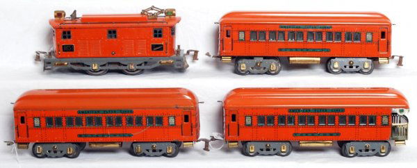 ![American Flyer Prewar #4654 orange electric with Bunker: American Flyer Prewar #4654 orange electric with Bunker Hill, and Yorktown passenger cars with orange litho / orange roof, with #4654 in C6 [note: bend in roof see pictures] and passenger cars in over](https://p1.liveauctioneers.com/7889/217558/111627679_1_x.jpg?height=280&quality=70&sharpen=true&version=1631220011&width=280)