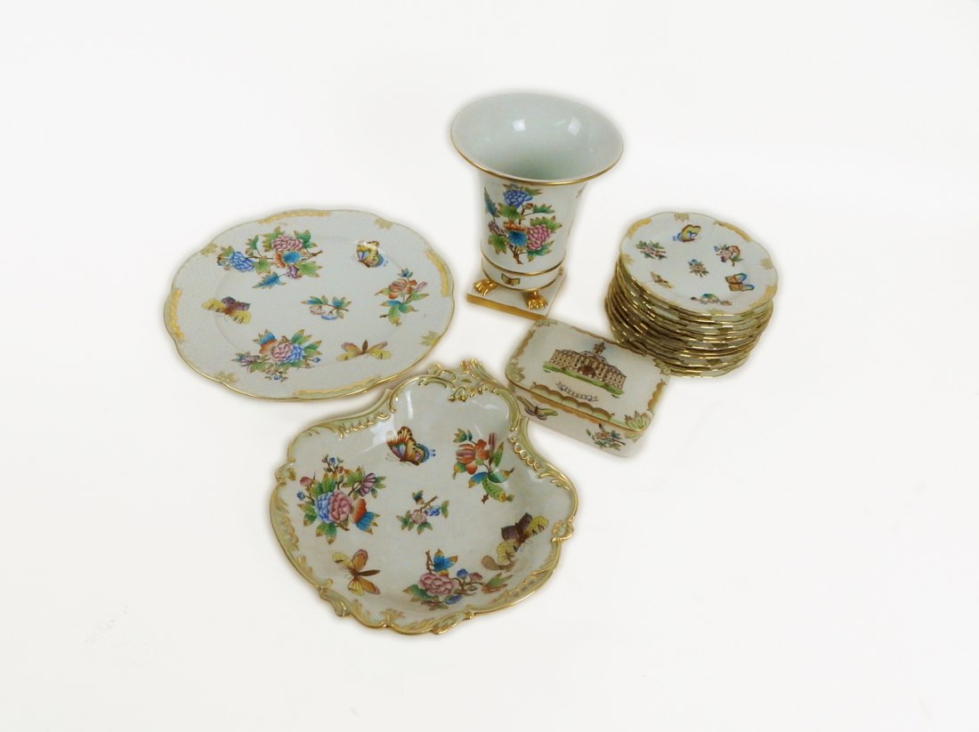 ![Group of Herend Porcelain: A group of Herend porcelain table articles. Comprises of a footed vase, 2 dinner plates, one lidded box, one large dish and 12 dessert plates. Dinner plate: [11" Dia.]. Footed vase: [7 1/4" H]. In goo](https://p1.liveauctioneers.com/1221/56636/27948993_1_x.jpg?height=280&quality=70&sharpen=true&version=1402354016&width=280)