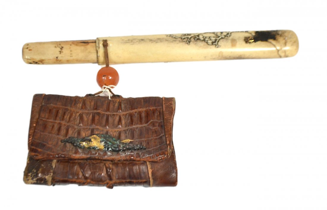 ![Antique Japanese Smoking Set: Antique sewn crocodile tobacco pouch with ojime bead accompanied by carved ivory cased pipe. Some splits to case and missing inlays. Wear to case, wear to pouch. [9 1/8" L].](https://p1.liveauctioneers.com/1221/52715/25441301_1_x.jpg?height=280&quality=70&sharpen=true&version=1394813517&width=280)