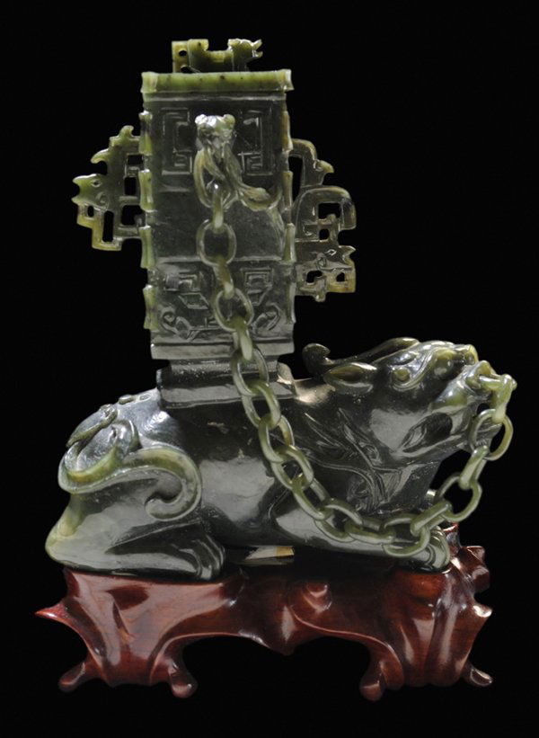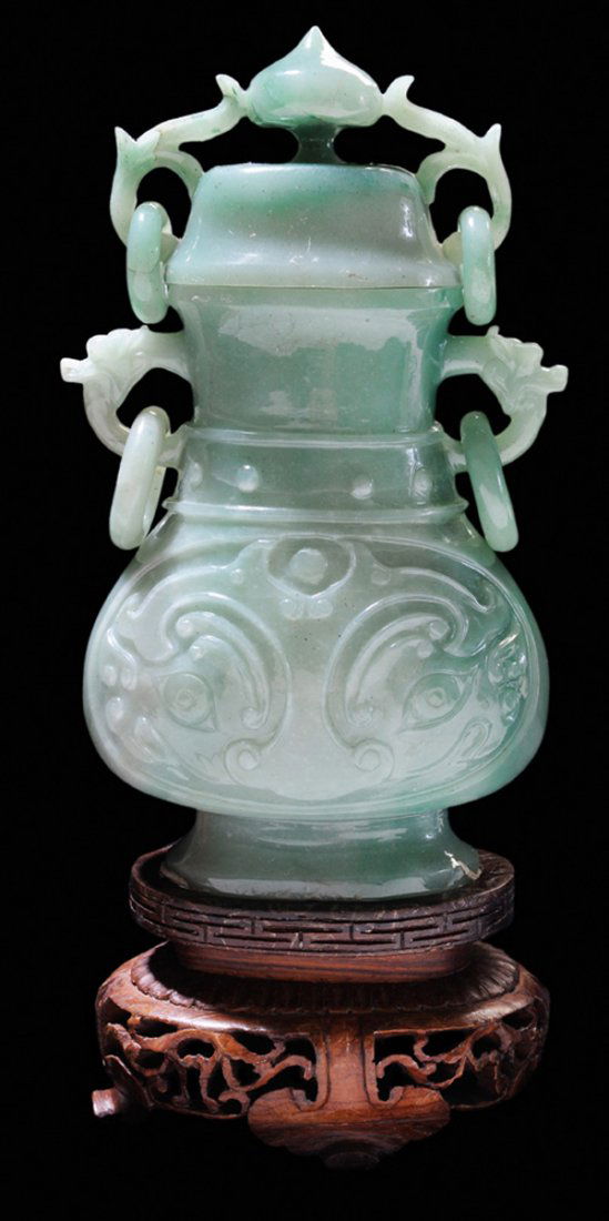 ![Jade [Hu]-Shaped Lidded Vase: Chinese, 20th century, possibly jadeite in a uniform soft green with brown around rich fractures, moderately translucent, carved on both sides, [taotie] or mythical beast face in relief on both sides](https://p1.liveauctioneers.com/33/39978/17153314_1_x.jpg?height=280&quality=70&sharpen=true&version=1366316975&width=280)