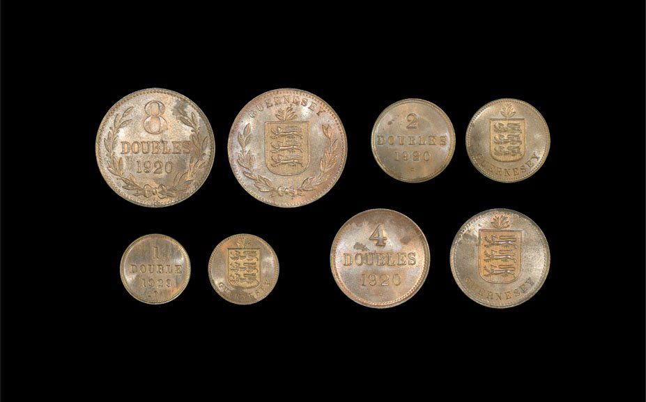 ![World Guernsey - 1920 - 8, 4, 2 and 1 Doubles [4]: Dated 1920 and 1929 (1 double only), Heaton mint. Obvs: arms with GUERNSEY legends. Revs: mintmark 'H', numeral mark of value with DOUBLES and date. S. 7214A/7215A/7216A/7217A. 20.44 grams total. [4,](https://p1.liveauctioneers.com/1191/38792/16613278_1_x.jpg?height=280&quality=70&sharpen=true&version=1363889857&width=280)