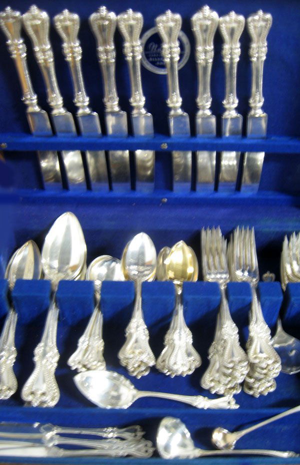 ![Sterling silver flatware by Towle ''Old Colonial'': Sterling silver flatware by Towle ''Old Colonial''. 4 serving spoons [1 monogrammed] 8 1/2''l, 4 serving spoons [1 monogrammed] 8 1/2''l, 9 knives 8 3/4''l, 12 salad forks 6 1/4''l, 18 dinner forks 7'](https://p1.liveauctioneers.com/54/33007/13328473_1_x.jpg?height=280&quality=70&sharpen=true&version=1348923775&width=280)