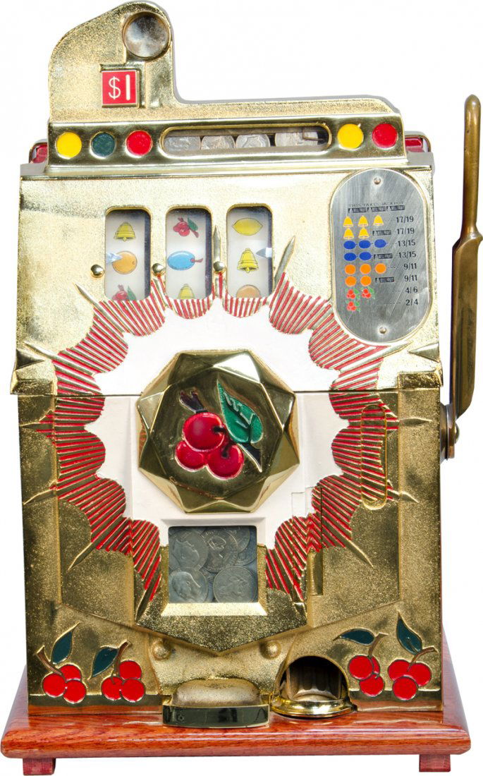 ![Mills 10 Cent “Bursting Cherry” Slot Machine. [Chicago: Mills Novelty Co., ca. 1930s].: Mills 10 Cent “Bursting Cherry” Slot Machine. [Chicago: Mills Novelty Co., ca. 1930s]. Three-reel slot machine with painted wooden frame and base, with metal front panel, with red and gree](https://p1.liveauctioneers.com/928/272850/143093911_1_x.jpg?height=280&quality=70&sharpen=true&version=1671645435&width=280)