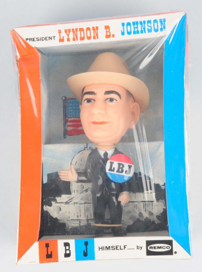 ![Lyndon B. Johnson Doll, LBJ / JFK Button, More: A vintage Remco LBJ doll [6" H], a large LBJ / JFK 44th Inauguration pinback button [6" Diam.] and a Democratic National Convention Dinner ticket stub. Provenance: From the Collection of Dr. Alan York](https://p1.liveauctioneers.com/1221/243451/126609535_1_x.jpg?height=280&quality=70&sharpen=true&version=1649868014&width=280)