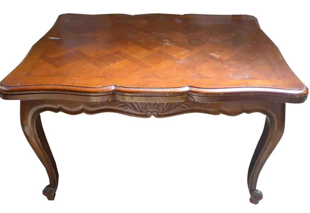 ![French Provincial Fruitwood Dining Table: French Provincial fruitwood dining table, 19th century, the country farm table with carved apron and raised on cabriole legs. [29" H x 72" W x 28 1/2" D].](https://p1.liveauctioneers.com/1221/339386/183844575_4_x.jpg?height=280&quality=70&sharpen=true&version=1723148184&width=280)