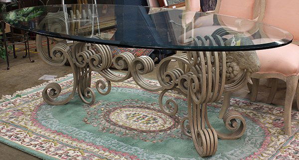 ![Louis XVI-Style Dining Table: Mahogany oval table with three leaves bearing tapered, fluted legs on wheels. [74" W x 44" D x 30" H. One leaf 23" W, two leaves 23 1/2" W]. Scratches and abrasions.](https://p1.liveauctioneers.com/1221/71085/36461505_1_x.jpg?height=280&quality=70&sharpen=true&version=1429715598&width=280)
