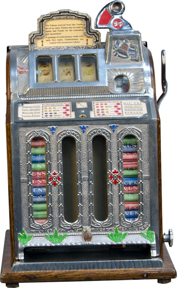 ![MILLS DIAMOND FRONT 10 CENT SLOT MACHINE: One-armed bandit slot machine, blue front with red diamonds, handle and coin slot. Paper rolls marked [copyright 1910 Bell, Fruit, Gum Mills Novelty Co.] // Measurements: 24" H X 15.5"](https://p1.liveauctioneers.com/6166/401264/222684678_1_x.jpg?height=280&quality=70&sharpen=true&version=1766357154&width=280)