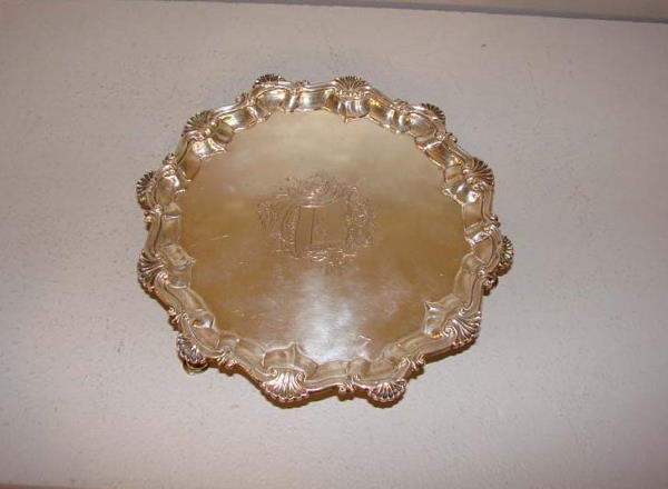 2 18TH C ENGLISH STERLING FOOTED TRAYSA silver salver, Thomas Heming, London 1771, of heA George III silver shaped circular salver by RobeA GEORGE II SILVER SALVER having a raised moulded shell