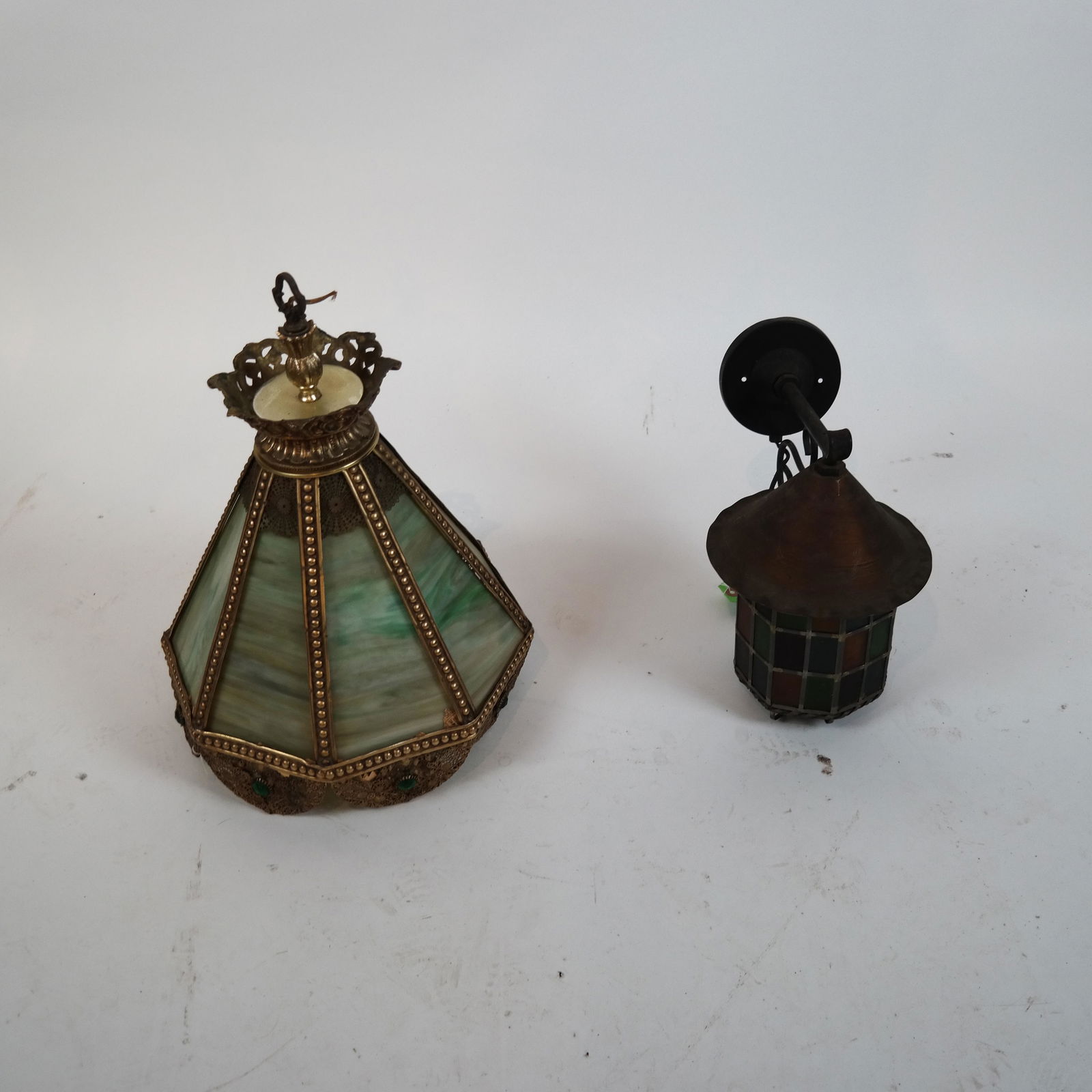 ![Stained Glass Chandelier and Coach-Form Lantern: A filigree, stained glass chandelier with web design at the top [20 x 15 (dia) inches] and a multicolor glass and copper coach-form lantern [13 x 12 1/2 inches].](https://p1.liveauctioneers.com/1221/153026/77262146_1_x.jpg?height=280&quality=70&sharpen=true&version=1572552974&width=280)