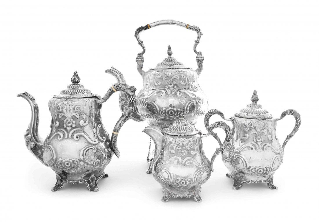 Browse a record of outcomes from past auctions, including sale prices and unsold items.STERLING SILVER 5 PC TEA SET W/ ASSOC. PLATED TRAYAn American Silver Four-Piece Tea Set, Height of kettleSet of 6 (Six) pcs Frank Whiting Sterling Silver TeaENGLISH SILVER PLATE TEA AND COFFEE SET, 5 PC, INCLUDES6 Piece Silver Plated Tea Set With Tray. Tray Legnthset of 4 Russian antique silver & cut glass tea glassesMIXED SET OF 6 COIN SILVER TEA SPOONS ST LOUIS(lot of 4) George III sterling silver tea set, London,3 piece silver Georgian tea set, bone knobs, 30 troylot of silver plated serving set tea pot and more7 Pc Korean Silver & Enamel Tea Caddy Set in Box2 tea sets & bowl, 3 piece silver plated & 3 pieceReed and Barton Sterling Silver Four Piece Tea Set withA four piece silver tea set with etched and embossedSET OF SIX ADOLF HITLER SILVER TEA SPOONS W BOXA German Art Deco Silver Plate Bakelite Coffee Tea Set(6 Pc) Antique RR English Sterling Silver Tea Spoons Set(3 Pc) Antique Chinese Qing Dynasty Silver Export Tea SetFabulous 3 Piece Signed Tiffany & Co. Sterling Silver Tea SetEnglish Sterling Silver Miniature Tea Set & Miniature Trophy 2.4 ozt.(8 Pc) Unusual Tiffany Studios Art Nouveau Silvered Tea SetWilliam Spratling, 4-Piece Sterling Silver and Rosewood Tea SetA set of six William IV silver king's pattern teasEnglish Silver Plate Tea Set, Ca. 20th C., 6 pcs