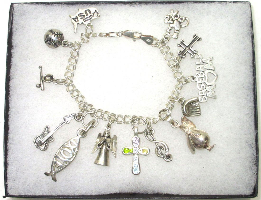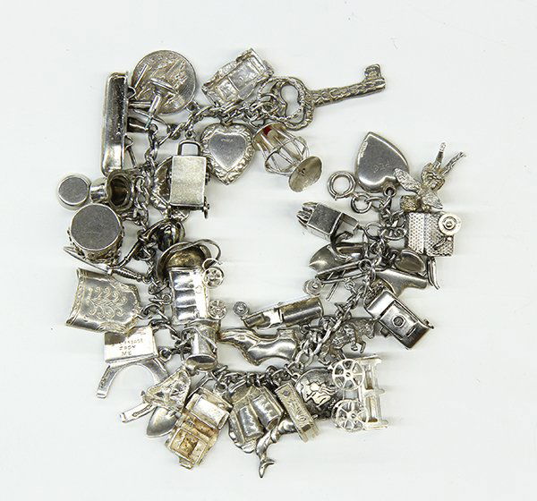![Sterling Silver Charm Bracelet: Sterling Silver Charm Bracelet, 6 3/4" oval link bracelet with 10 charms, early to mid 20th C, 2.33 ozts. [6] CONDITION: Good, used condition, tarnished.](https://p1.liveauctioneers.com/456/159249/80390143_1_x.jpg?height=280&quality=70&sharpen=true&version=1578602527&width=280)