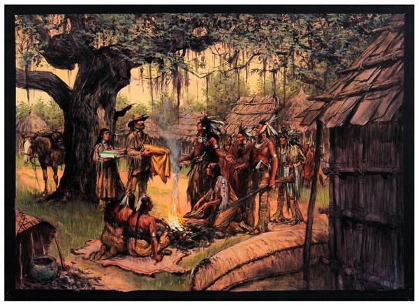 ![R. Tom Gilleon: (Montana/Florida, born 1942), [Trading Cloth with the Indians,] from the Savannah Project, unsigned, titled verso, watercolor, gouache and pencil on illustration board, labels verso for "Landmark Ente](https://p1.liveauctioneers.com/33/21918/7577919_1_x.jpg?height=280&quality=70&sharpen=true&width=280)
