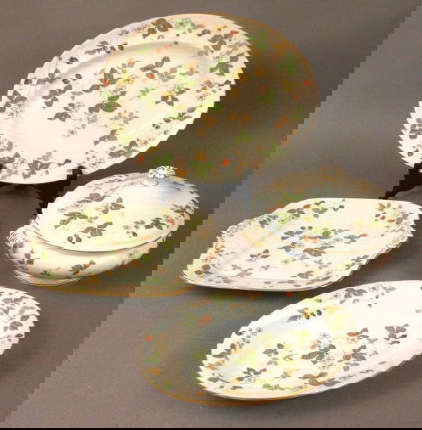 ![Wedgwood Wild Strawberry china: five 9 in. plates, ten 10-3/4 in. plates, seven 8 in. plates, ten 2-1/4 x 4 in. cups, twelve 6 in. saucers, nine 6 in. plates, [one chipped], (53 pieces). Minor chips, wear to gilding, surface scratch](https://p1.liveauctioneers.com/33/1346/574106_1_x.jpg?height=280&quality=70&sharpen=true&width=280)