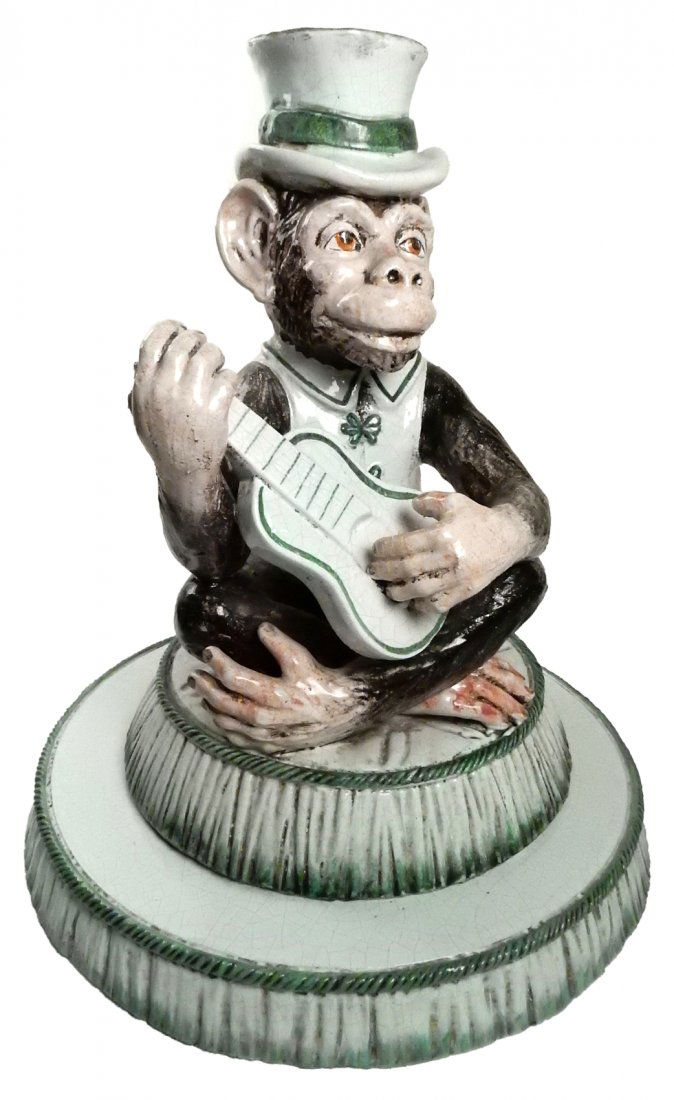 ![Terracotta Glazed Monkey Low Table: Glazed terracotta table with pedestal of a monkey playing the guitar. [Top of table: 19 1/2" Dia; Side table: 23" H]. Top of table is detached and top of guitar is broken off/missing.](https://p1.liveauctioneers.com/1221/61409/30669302_1_x.jpg?height=280&quality=70&sharpen=true&version=1411496753&width=280)